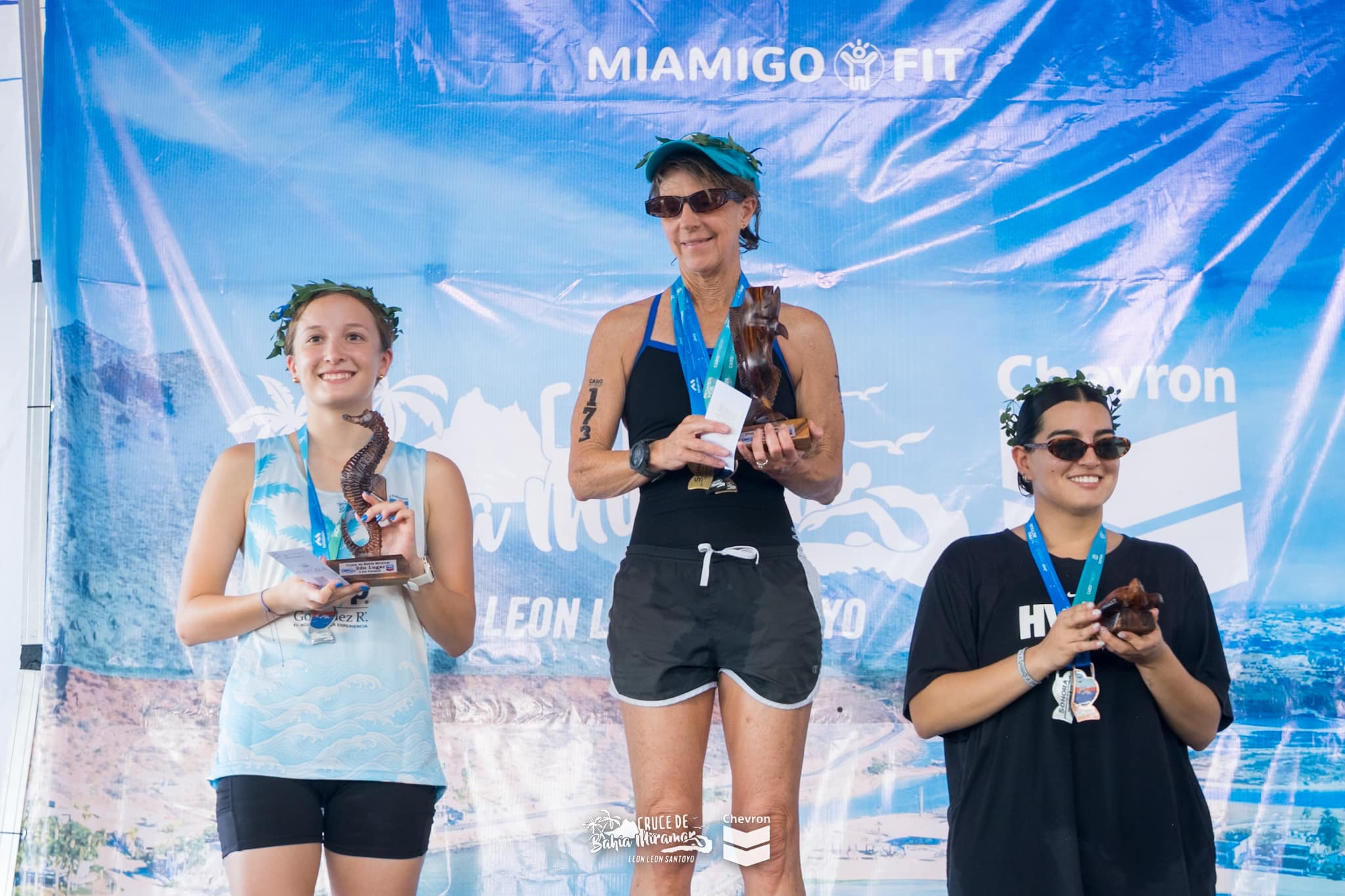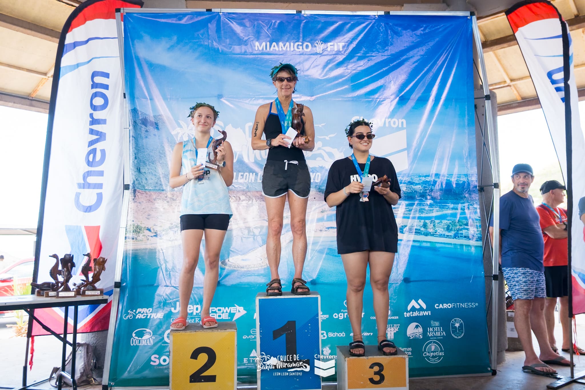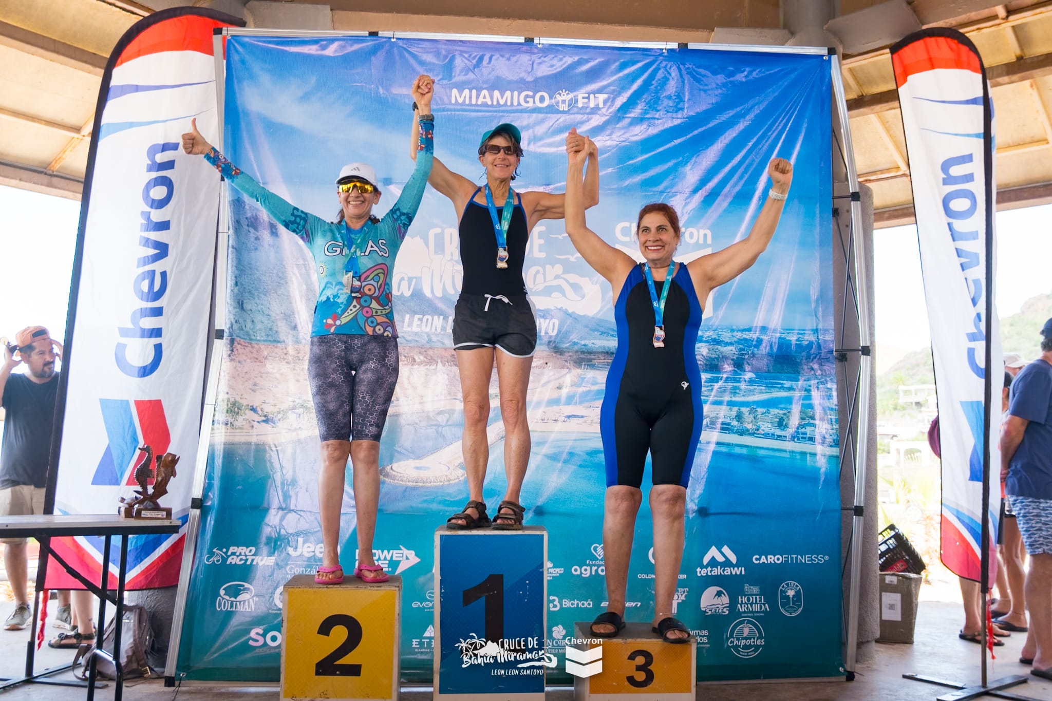The results were posted before the awards ceremony. I learned that I had not only won first place in my age group but that I was also the fastest overall woman in the 2K. I’ve never achieved this goal before and to do it at age 62 feels like a real accomplishment. There was a long wait for the ceremony but it was worth it to sweat and be hot for a while. Mi Amigo Fit knows how to put on a good event. There were lots of sponsors and there was energetic music and plenty of excitement for the awards. I ran into Jose, a man in Chris’s age group who I had met at another swimming race in Miramar 3 years ago. He had been the winner of their age group and Chris had raced, getting second place that time. This year, Jose won his age group again, 13 minutes ahead of the second place finisher!
